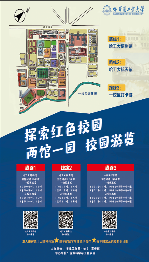 此次校园游览活动共有博物馆、航天馆、校园打卡三条线路,根据计划线路先后带领新生及家长参观了博物馆、航天馆等特色展馆,并着重向新生及新生家长介绍了主楼、校部楼、哈工大星、校训石等极具工大精神的建筑物。