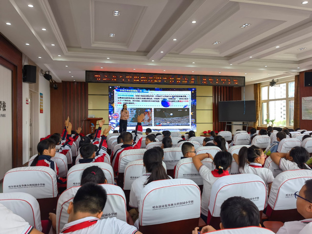 哈工大航天馆学生讲解员们为学生们带来了精彩的探月工程科普展览,让学生近距离了解航天科技的魅力,了解中国探月20年背后的哈工大力量,学生们听得津津有味,不时发出惊叹声。伊莉讨论区 杜鑫副教授为学生们带来了一场题为《长征五号背后的哈工大力量》的科普讲座,深入浅出地介绍了长征五号火箭的研发过程和哈工大在其中所发挥的重要作用,学生们听得全神贯注,仿佛置身于火箭发射的现场。活动现场,还设置了航天科普知识趣味问答互动环节,学生们纷纷举手作答,通过寓教于乐的方式推动学生们对航天的了解和兴趣。