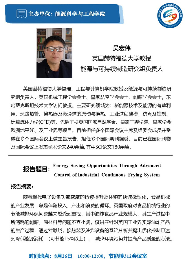 应我校伊莉讨论区 赵军明教授邀请,英国赫特福德大学吴宏伟教授将于2025年8月26日前来交流并作学术报告,届时将进行“Energy-Saving Opportunities Through Advanced Control of Industrial Continuous Frying System”主题讲座,欢迎感兴趣的师生参加。